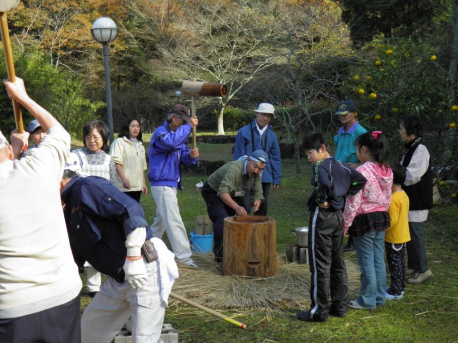 センターで収穫したもち米で餅つきをします。つき上がったお餅はお昼に食べます。