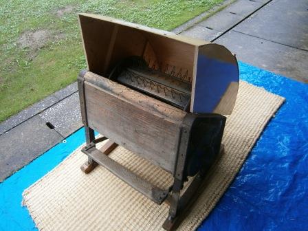 脱穀した収穫物を、ゴミと実に風の力を使って分ける機械です。